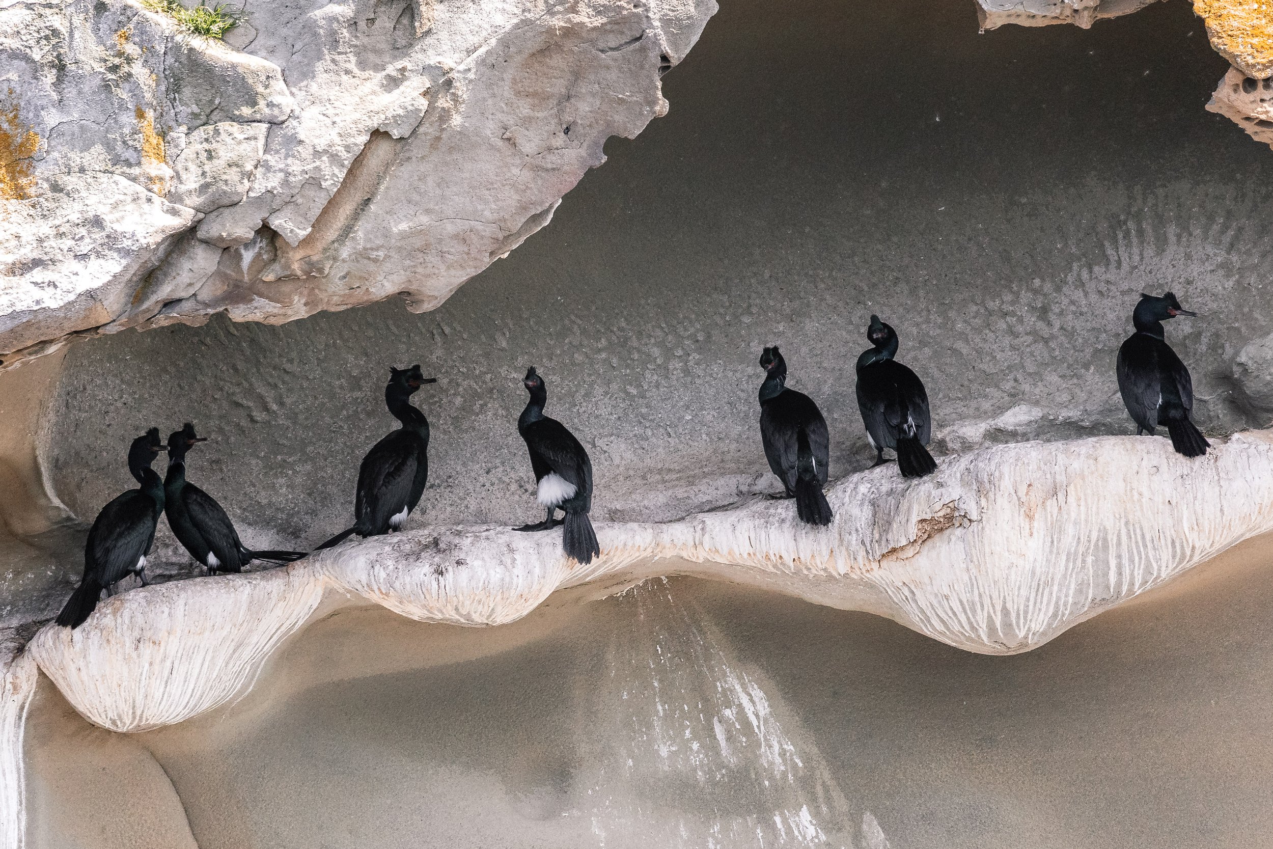 Pelagic cormorants with their white ‘pantaloons’ visible, standing at the cliffside.