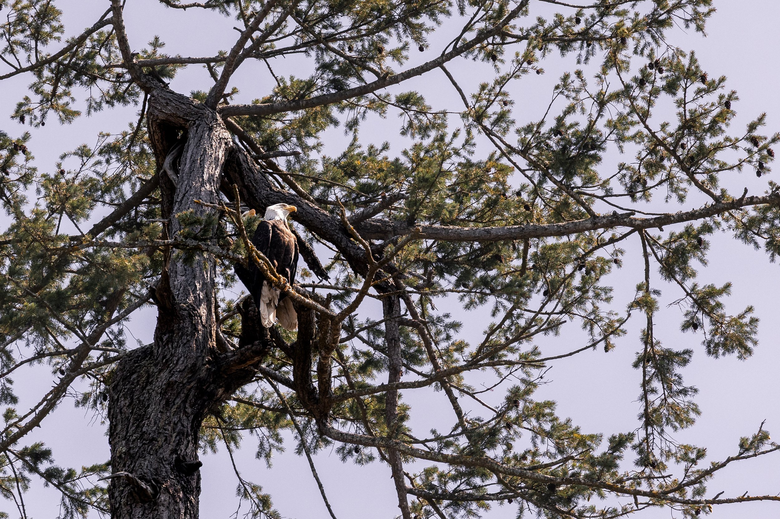 Not one but TWO Bald Eagles perched together high in a tree.