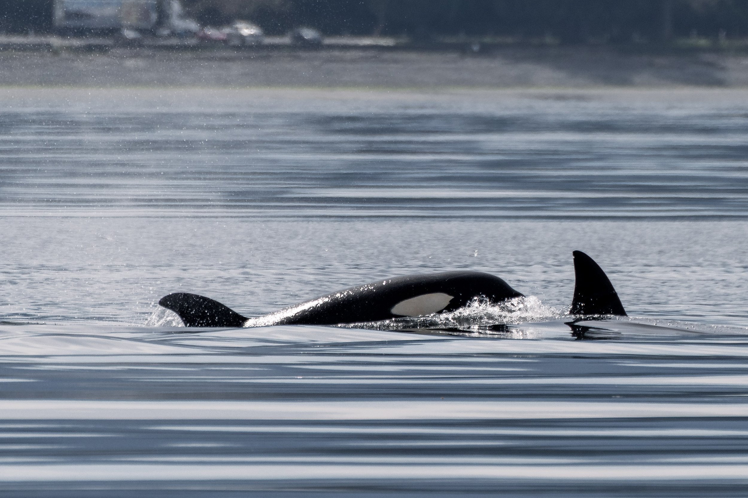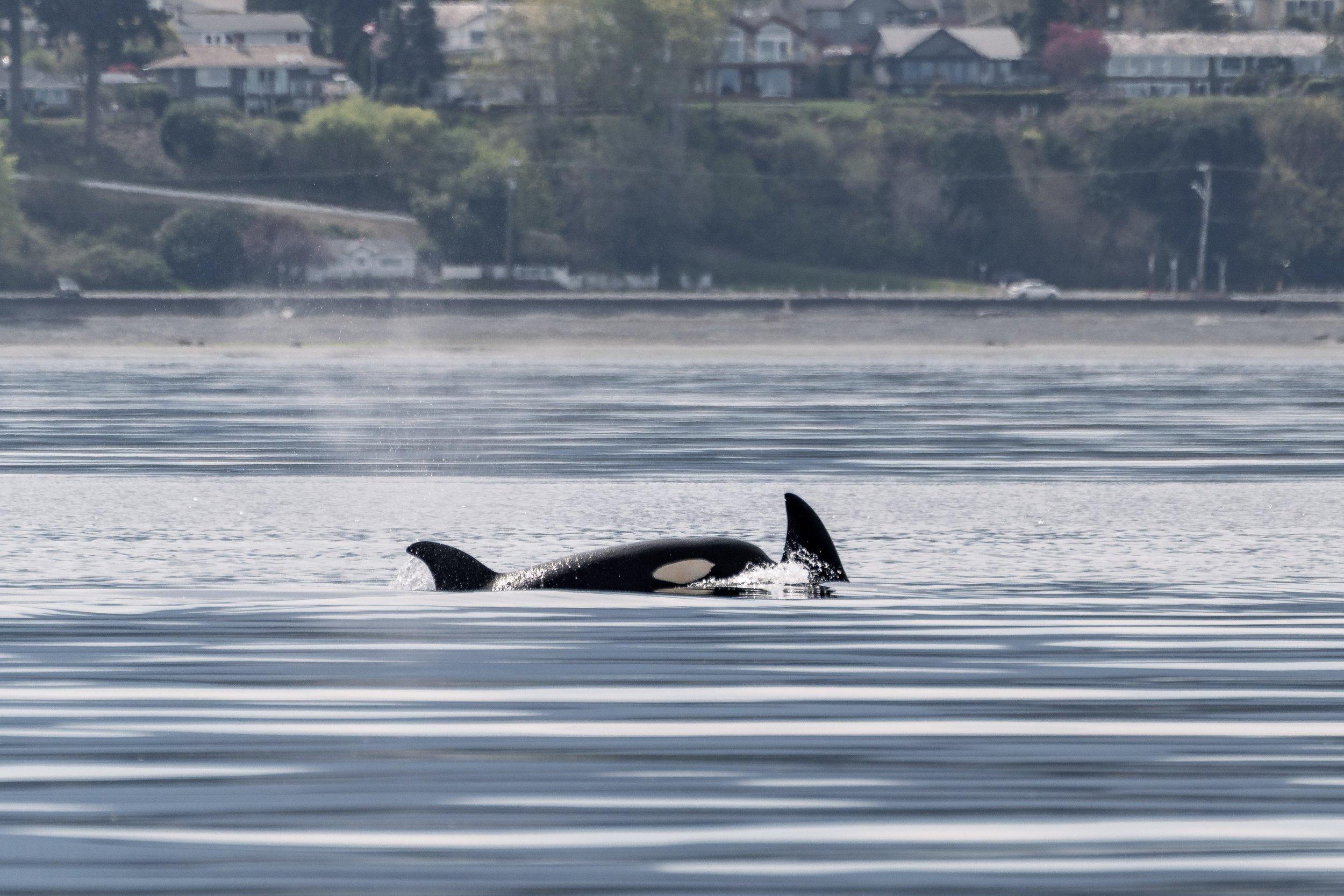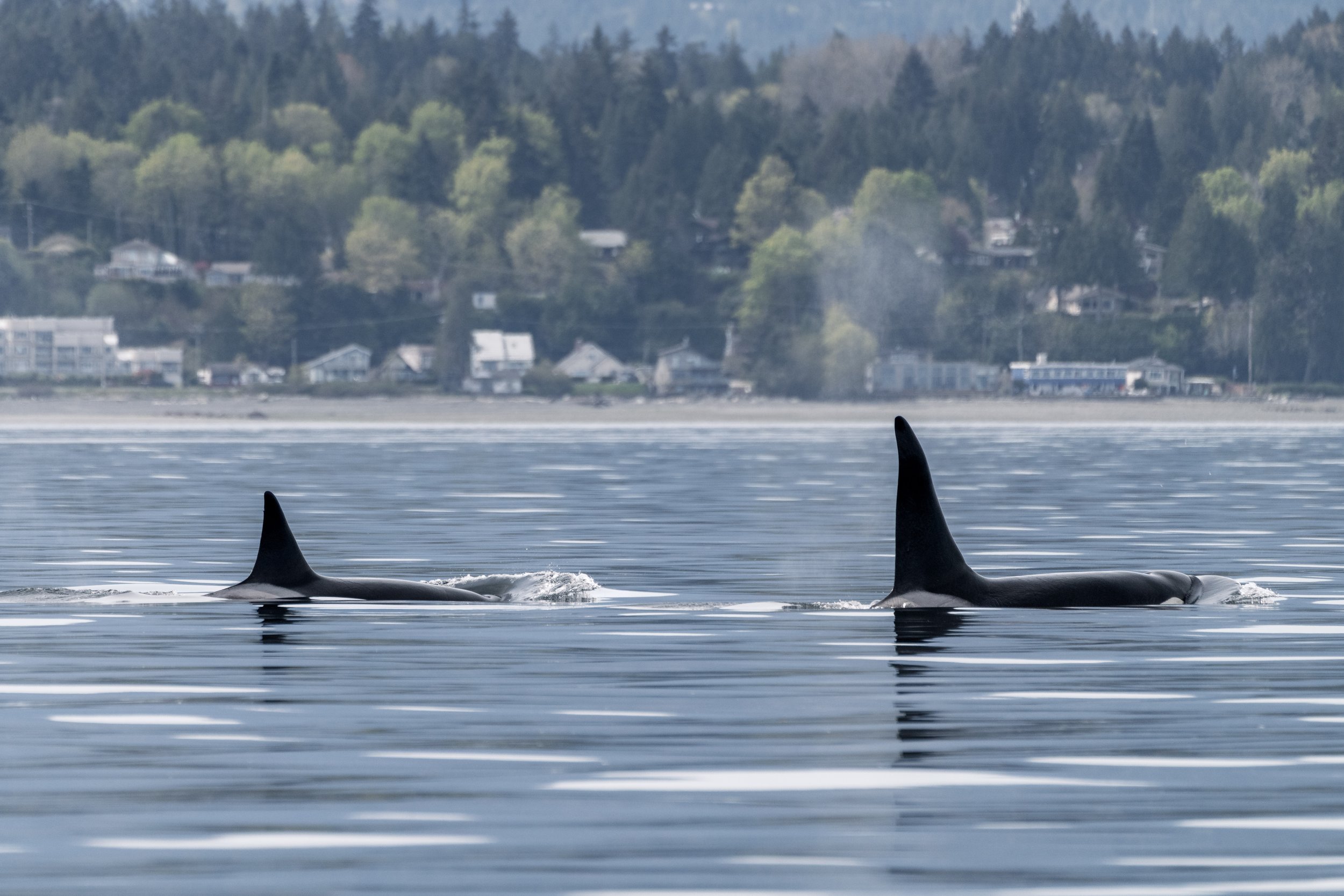 T117B Nyx surfacing with her calf close beside (can you see the tip of their dorsal fin?) and T172 Katmai to their right.