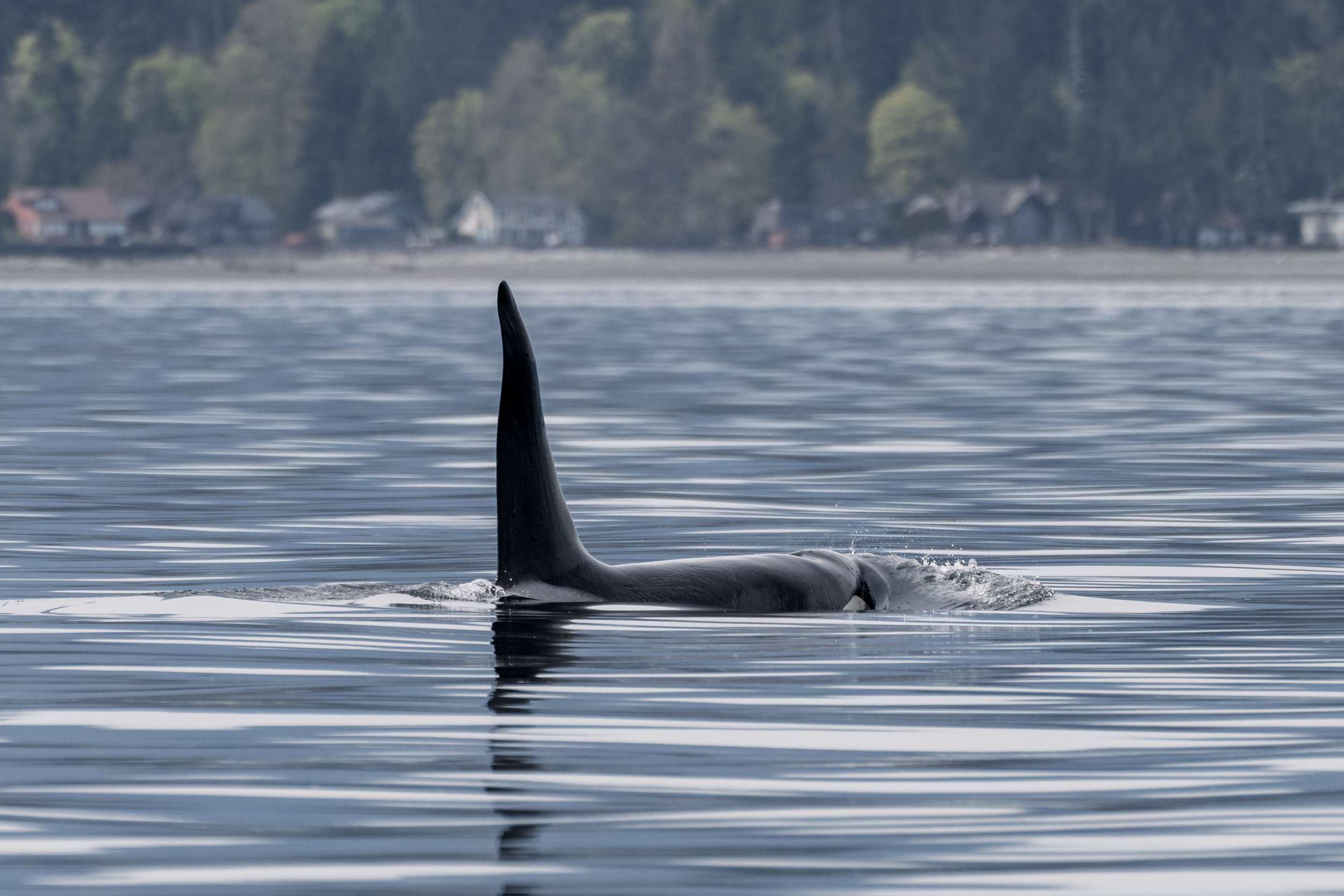 Watching these huge animals moving through these calm waters so gracefully was an amazing sight. When we first found them, they were spread out into groups of two, with Nighthawk and Katmai travelling together and Nyx and Noctis together, likely spreading out to look for prey. They eventually came back together, and we got to see all four of them swimming side-by-side for the second half of our time with them. Seeing the size difference between Noctis and Nigthawk was pretty special. Adult males get to be a fair amount larger than the females of the species, getting to lengths of 8 meters and weighing nearly 15 tonnes. Females max out around 6 meters in length, and only get to about 10 tonnes. This size difference isn’t what usually sets apart the males from the females, though, as the more obvious difference is their dorsal fin! A male, after having gon through puberty, will have an elongation of their dorsal fin compared to the others, and that fin may reach heights of 6 feet. Females will keep a smaller fin their whole lives, having a maximum height of closer to 3-4 feet. Having the wide range of sizes and shapes, and so many unqiue notches, mde this group very interesting to watch as they travelled northwest, following the shoreline of Vancouver Island.