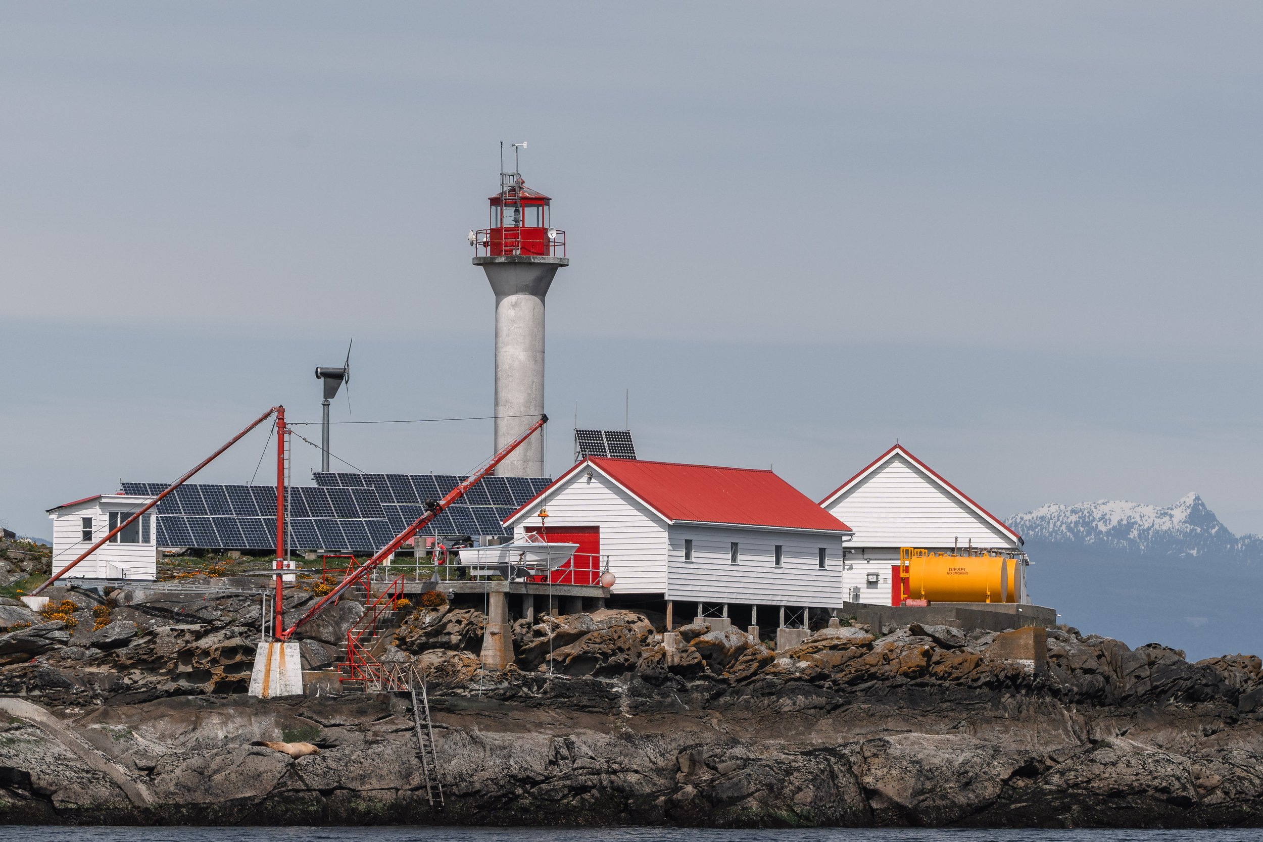 Eventually, it came time for us to leave these uncommon visitors to their travels, and we started the long journey home. Glassy calm conditions gave way to some waves, but we didn’t let that stop us from finding more wildlife! Closer to Nanaimo, we stopped at Snake Island to view a group of Harbour Seals that were hauled out on the rocky shores. These small marine mammals are the main food source for the Transient Orca we had seen before and also act as important hunters themselves, catching a wide variety of Fish and Cephalopod species. These animals do a great job of blending into their environment, with variations in their fur colour and surface speckles to help them avoid detection. Hauling out on the rocks like this helps keep them safe from ocean predators and supports their thermoregulation. Even though they have fur and blubber to protect them from the cold water, they still need to spend nearly half their day on the rocks to maintain a proper temperature.