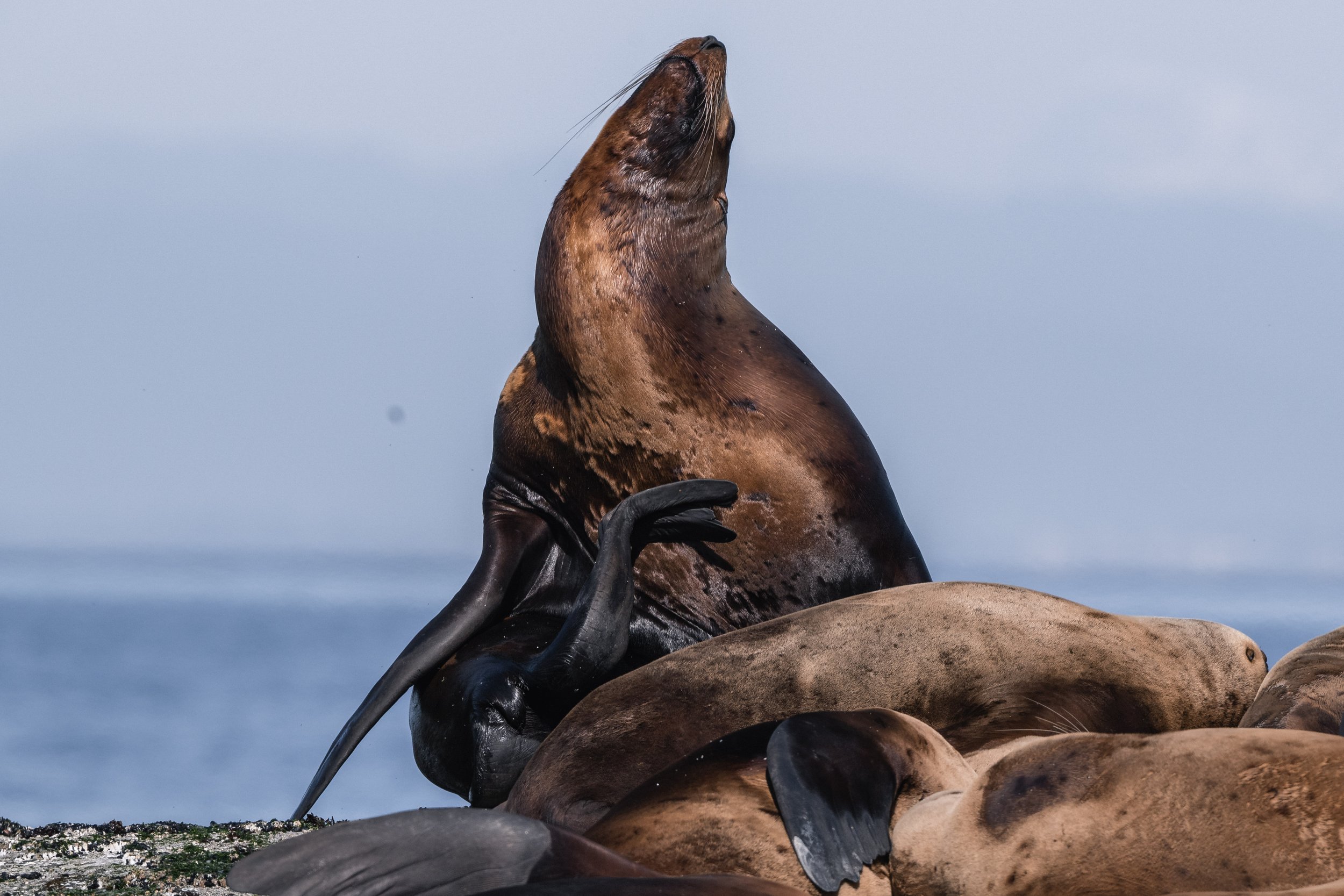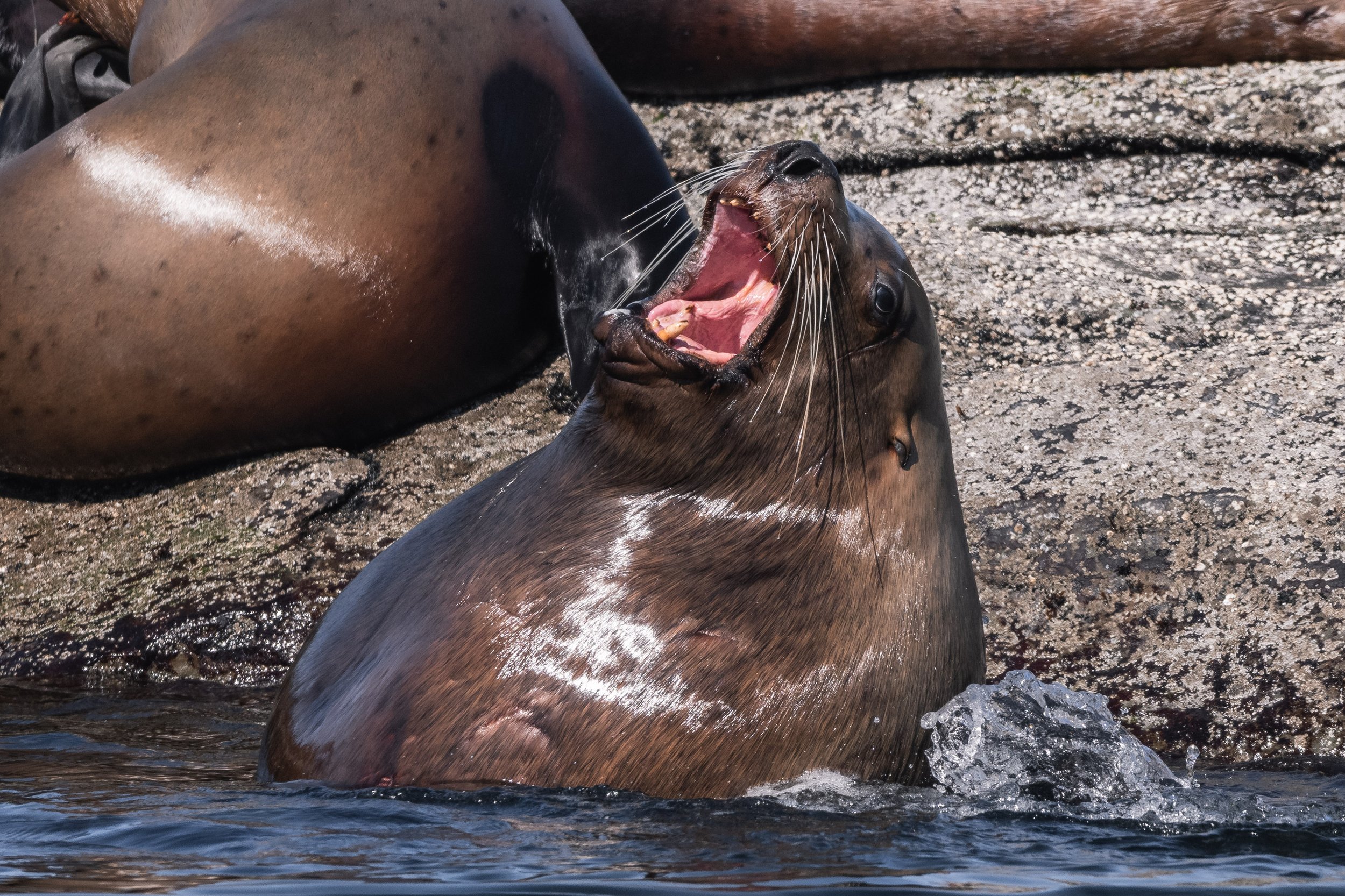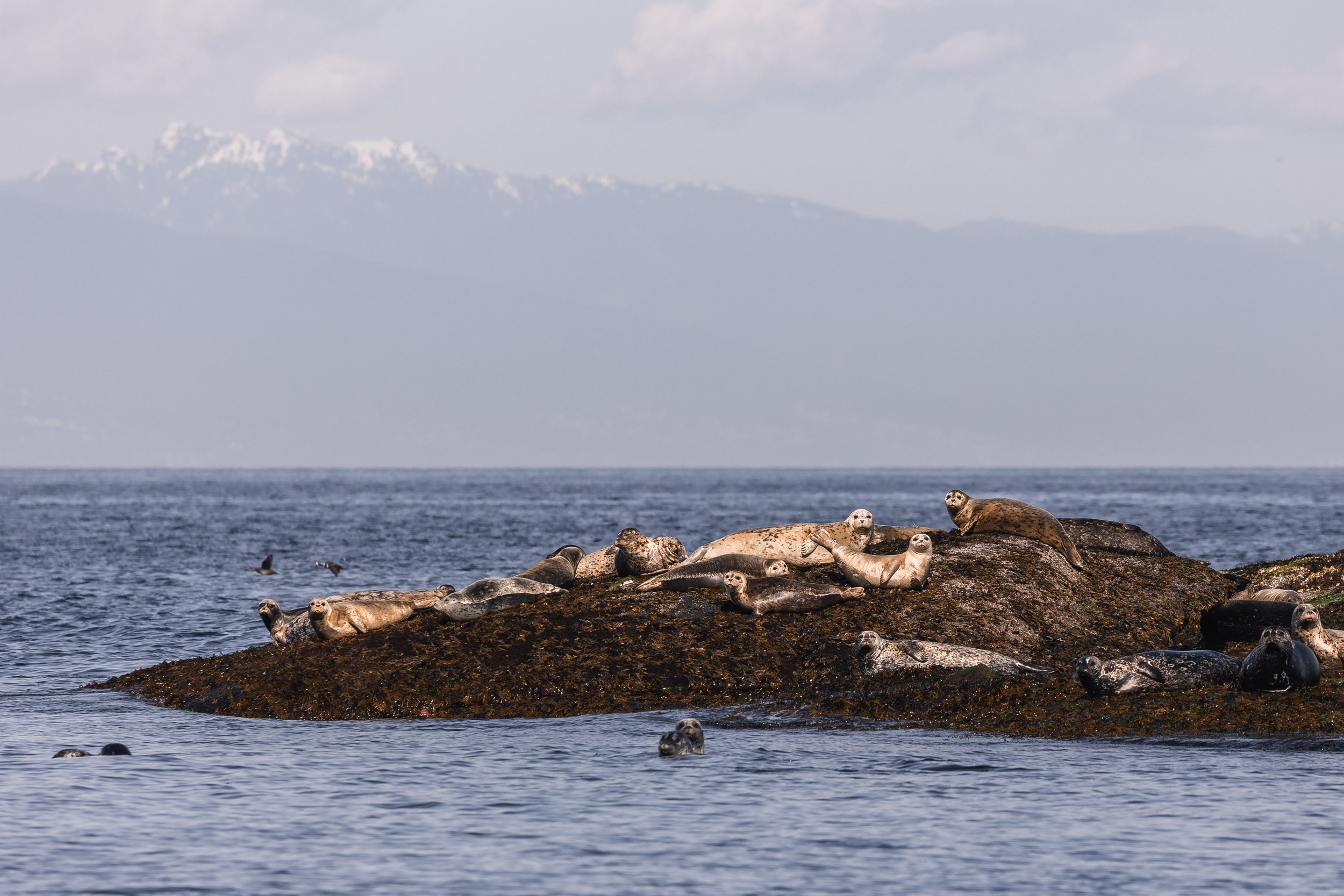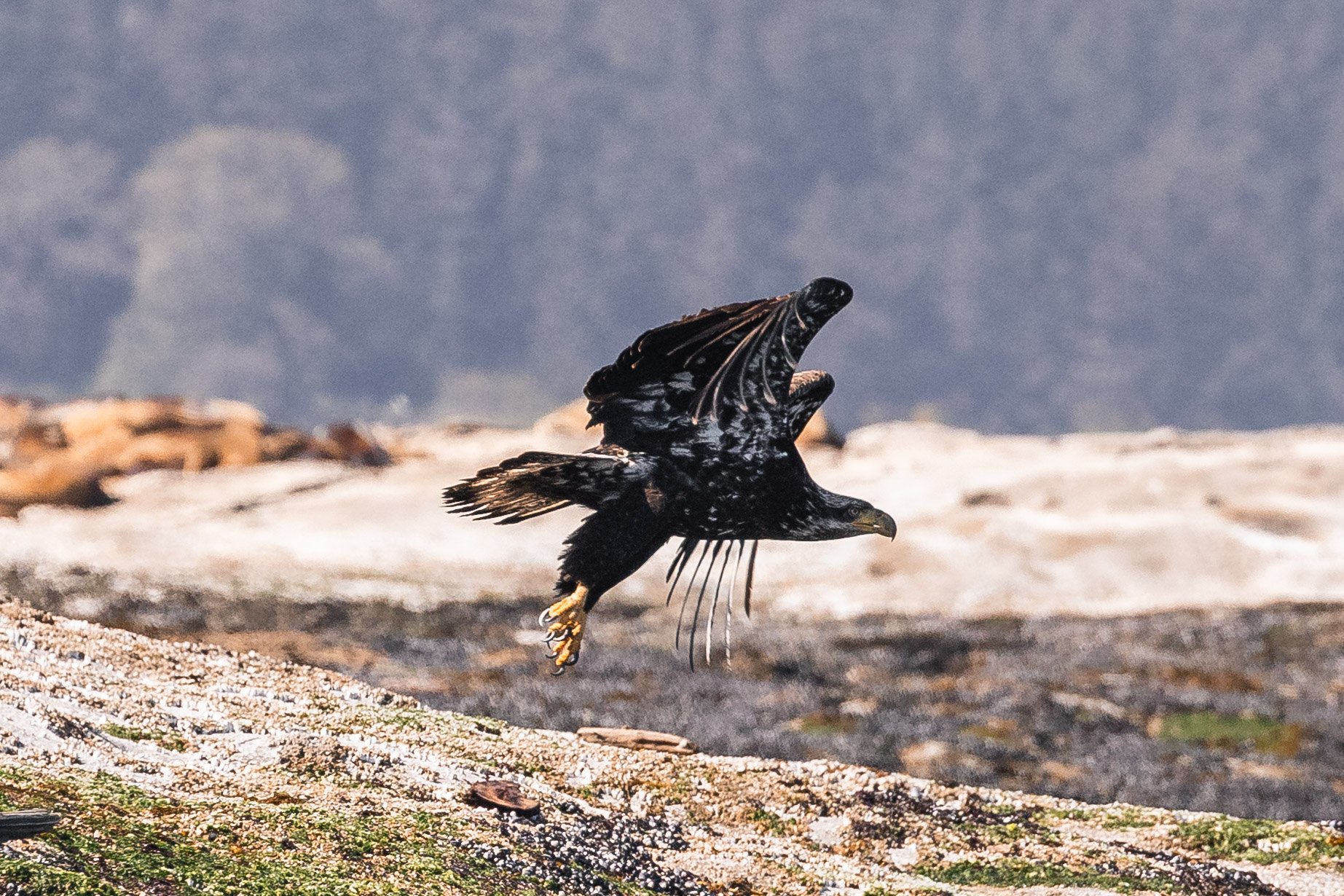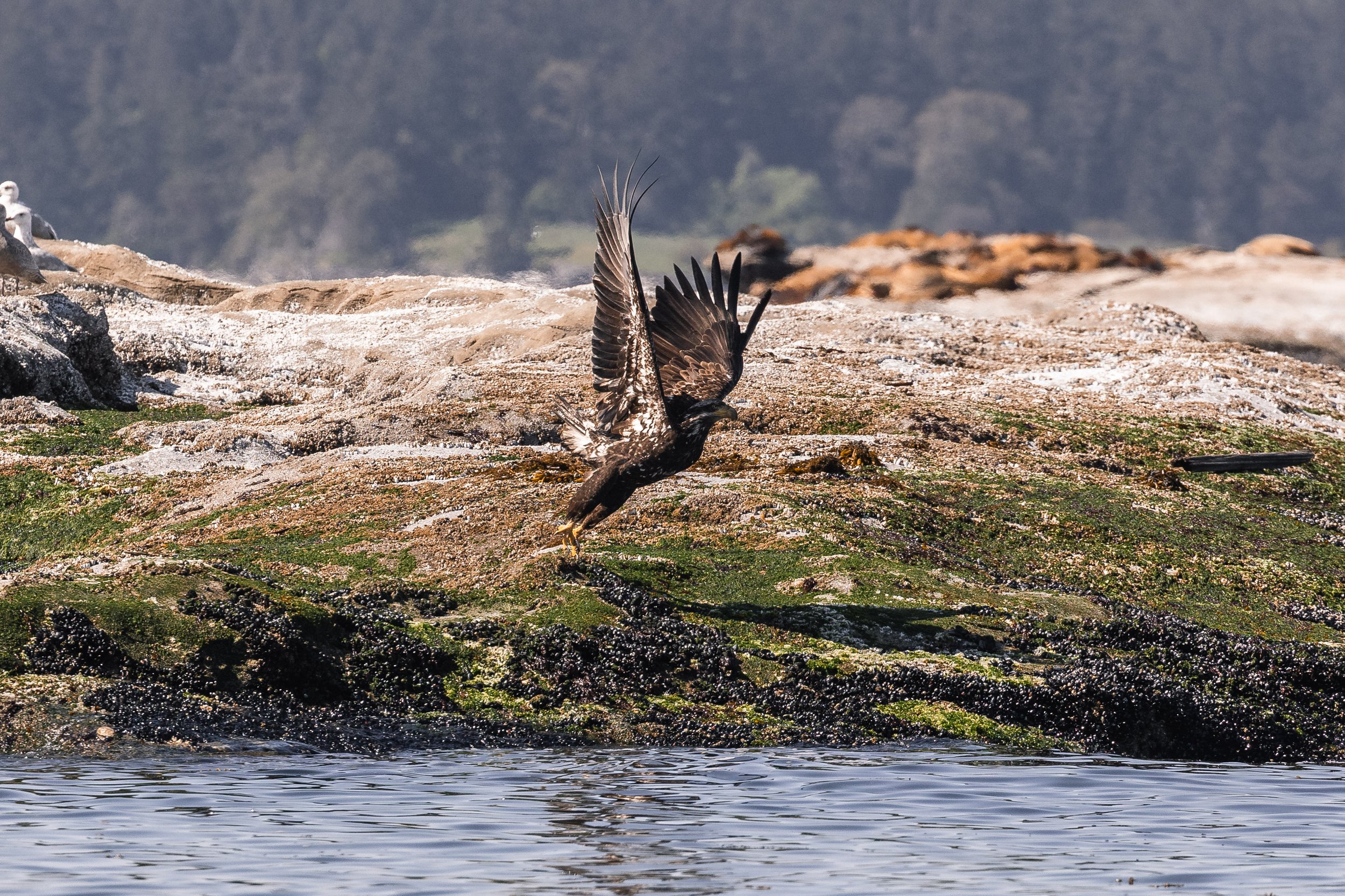 Soon it was time for us to say goodbye to the orca and continue on our way. The day was far from over, though, and we were eager to see what the rest of the trip had in store for us. We raced onwards, cruising through the Strait, until we made our way over to a small rocky group of islands off Valdez Island. Here, Steller Sea Lions wandered the shores, yawning and baring their giant teeth. Some were also swimming along, cautiously eyeing us up as they passed by. On the opposite side of the rocks, Harbour Seals flopped along, trying to find a spot to nap. Juvenile Bald Eagles were also spotted nearby, picking through the shallows, looking for a bite to eat.