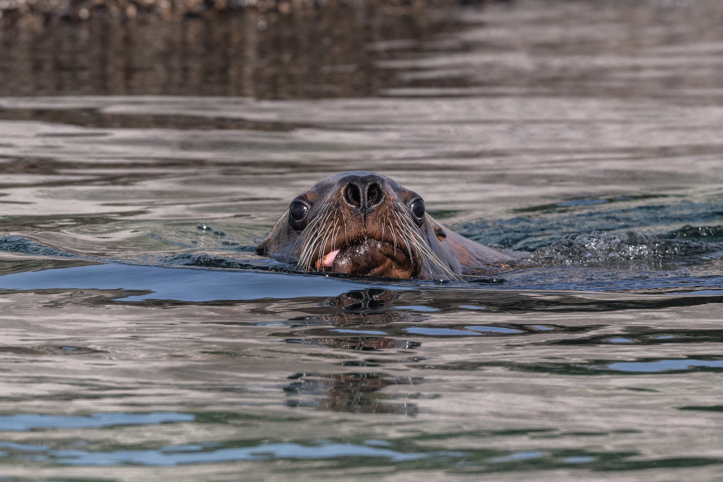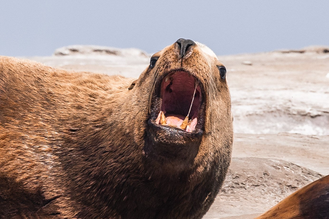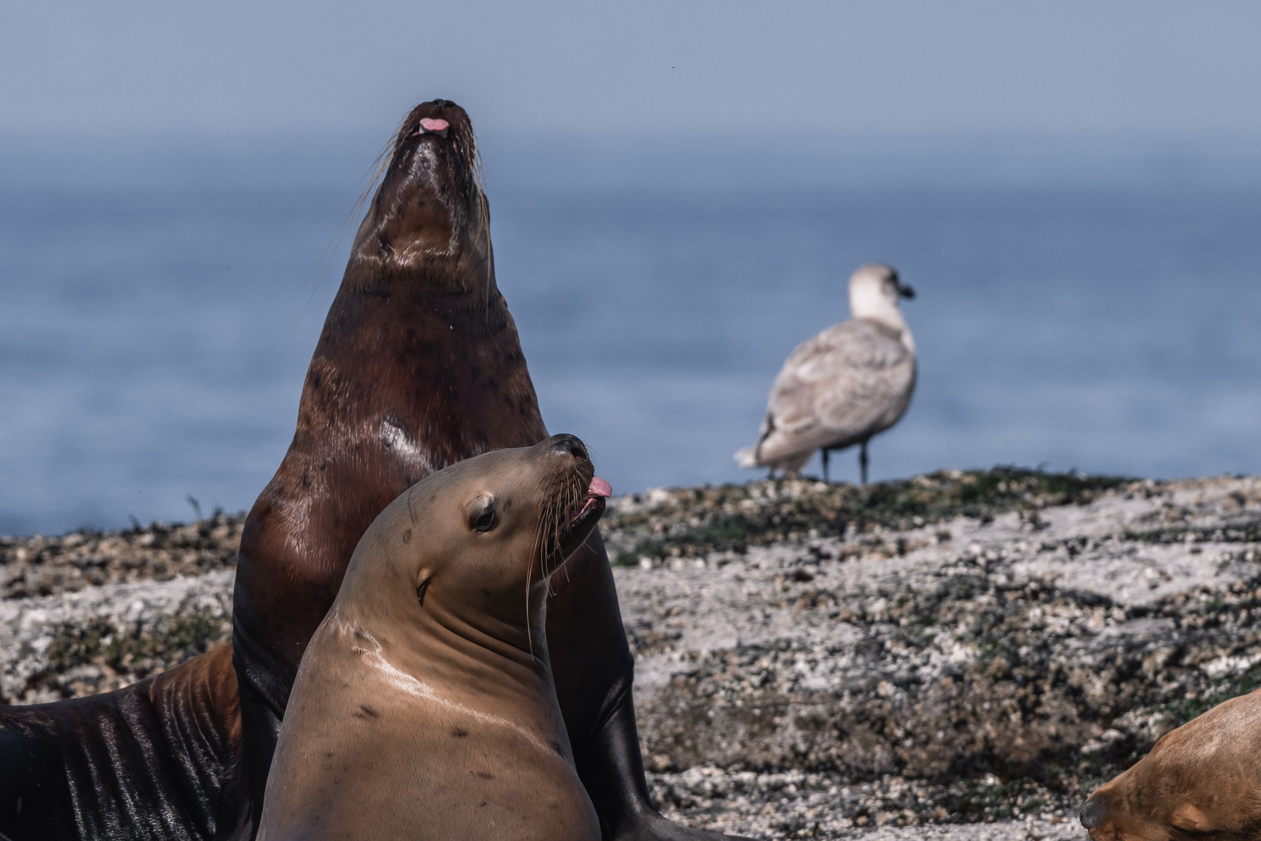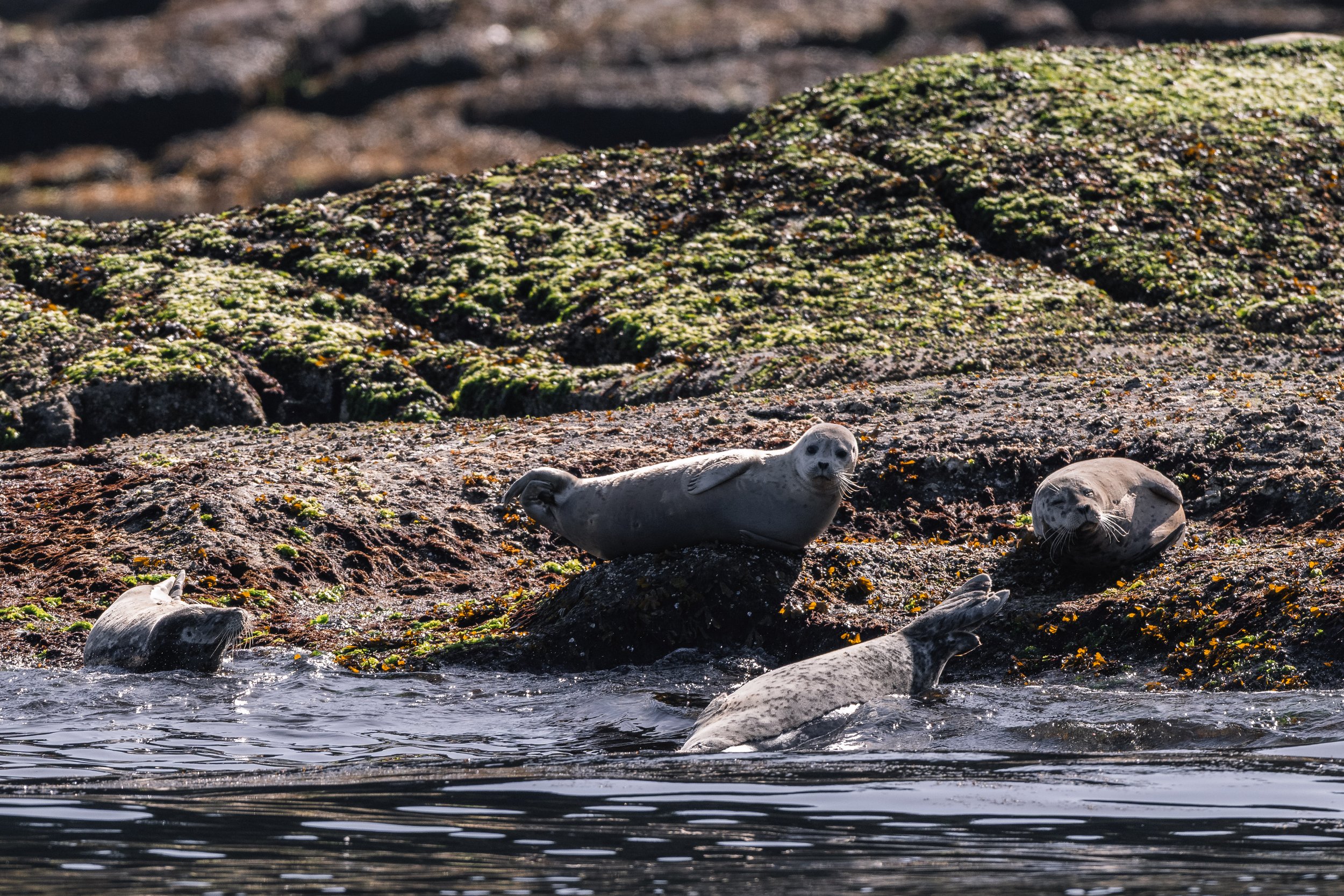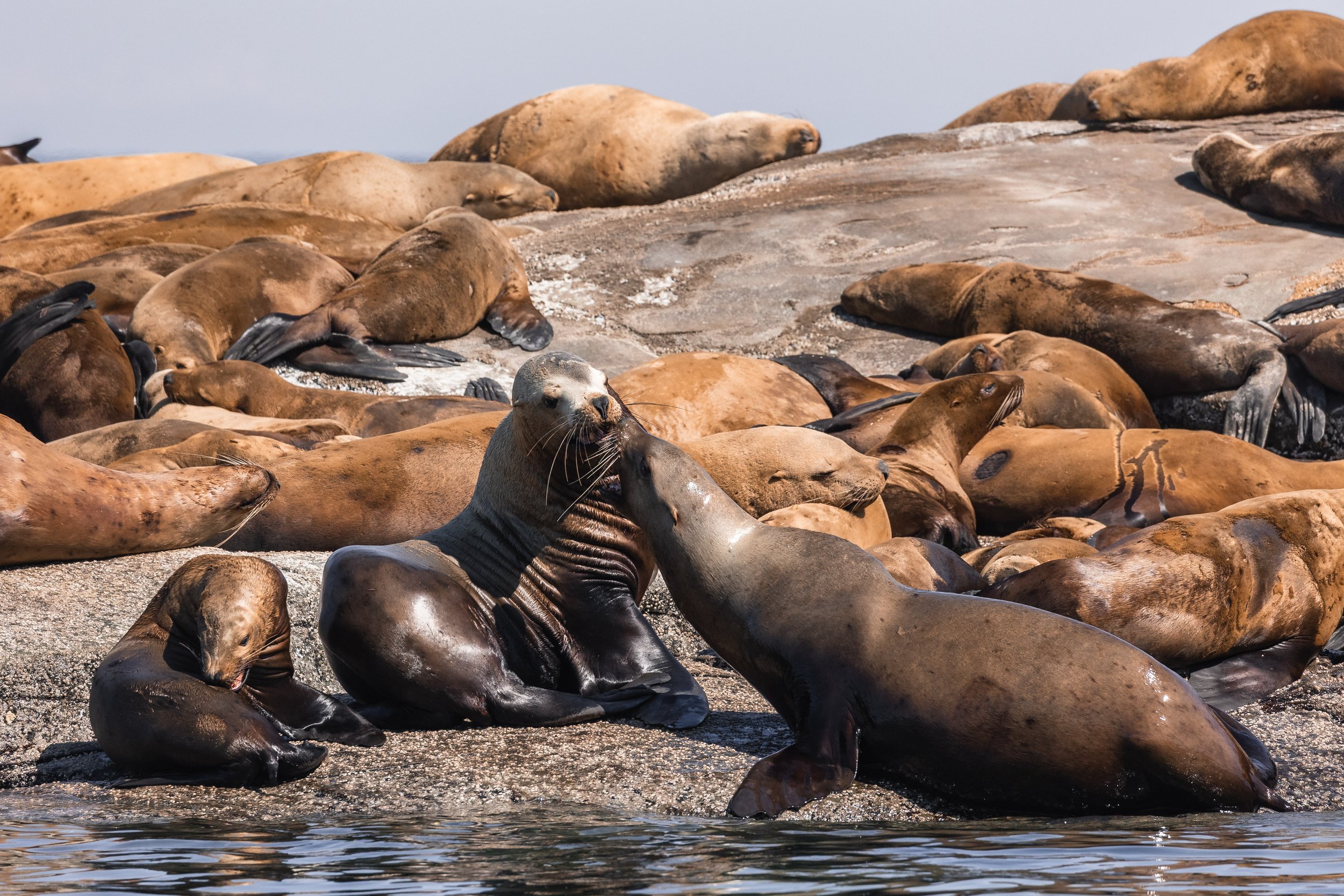 Soon it was time for us to say goodbye to the orca and continue on our way. The day was far from over, though, and we were eager to see what the rest of the trip had in store for us. We raced onwards, cruising through the Strait, until we made our way over to a small rocky group of islands off Valdez Island. Here, Steller Sea Lions wandered the shores, yawning and baring their giant teeth. Some were also swimming along, cautiously eyeing us up as they passed by. On the opposite side of the rocks, Harbour Seals flopped along, trying to find a spot to nap. Juvenile Bald Eagles were also spotted nearby, picking through the shallows, looking for a bite to eat.