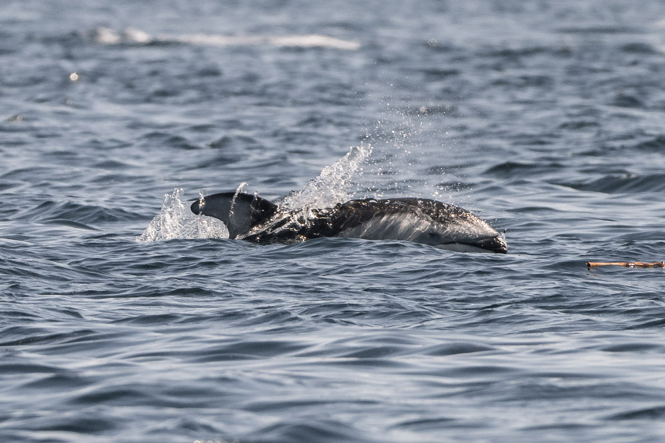 A Pacific white-sided dolphin with its beautiful two-toned dorsal fin visible. Photo by Vanessa Vereschahen.