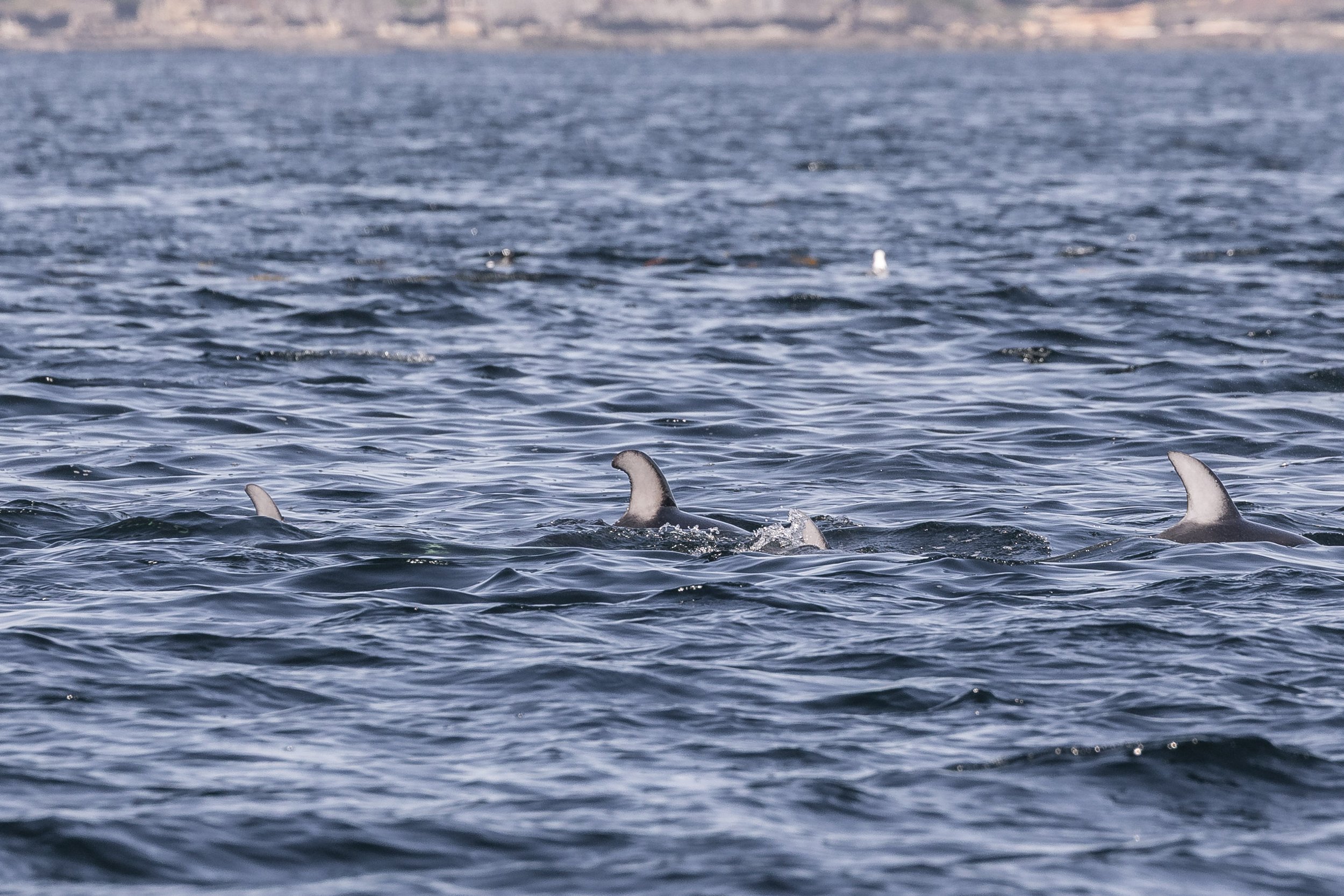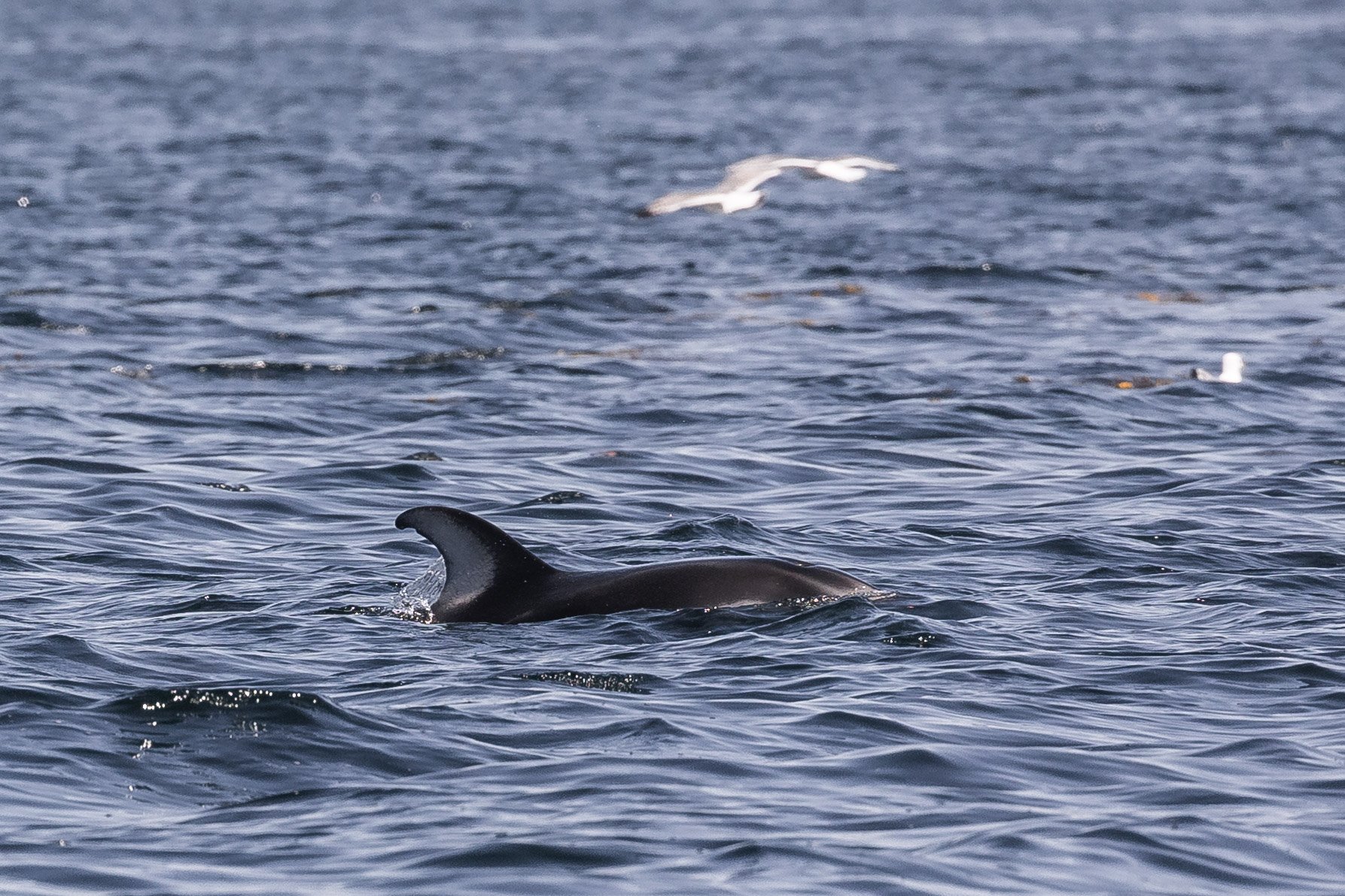 To start the day off strong, we travelled over to where several dolphins had been spotted. We scanned the waters ahead of us, until we spotted them. Several small, hooked dorsal fins were slicing through the water, speedily travelling along and playing in a boat’s wake. While our area is a perfect environment for Pacific white-sided dolphins, they are an uncommon species to see here, with most of their sightings occurring closer to Campbell River. Because of this, every encounter with them is extra thrilling to us!