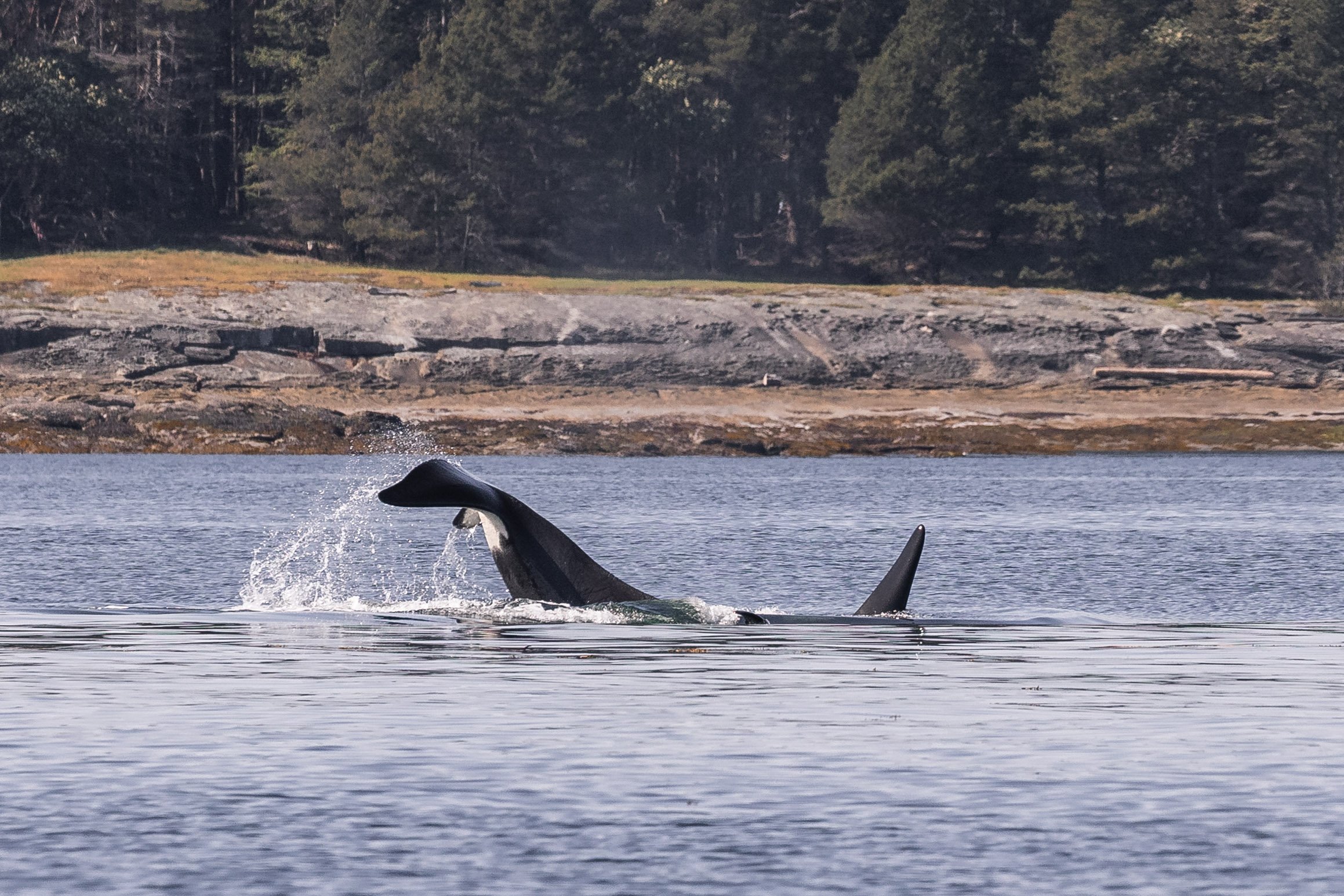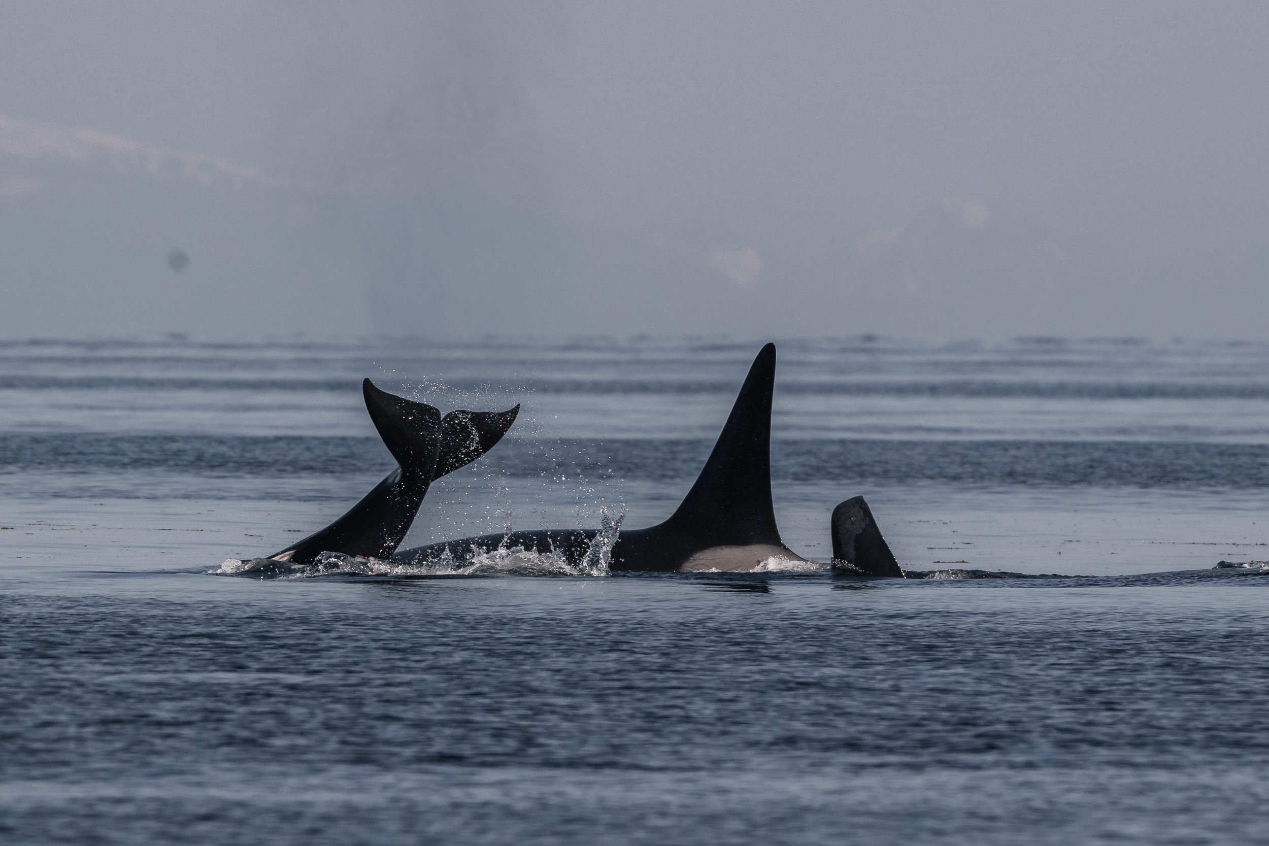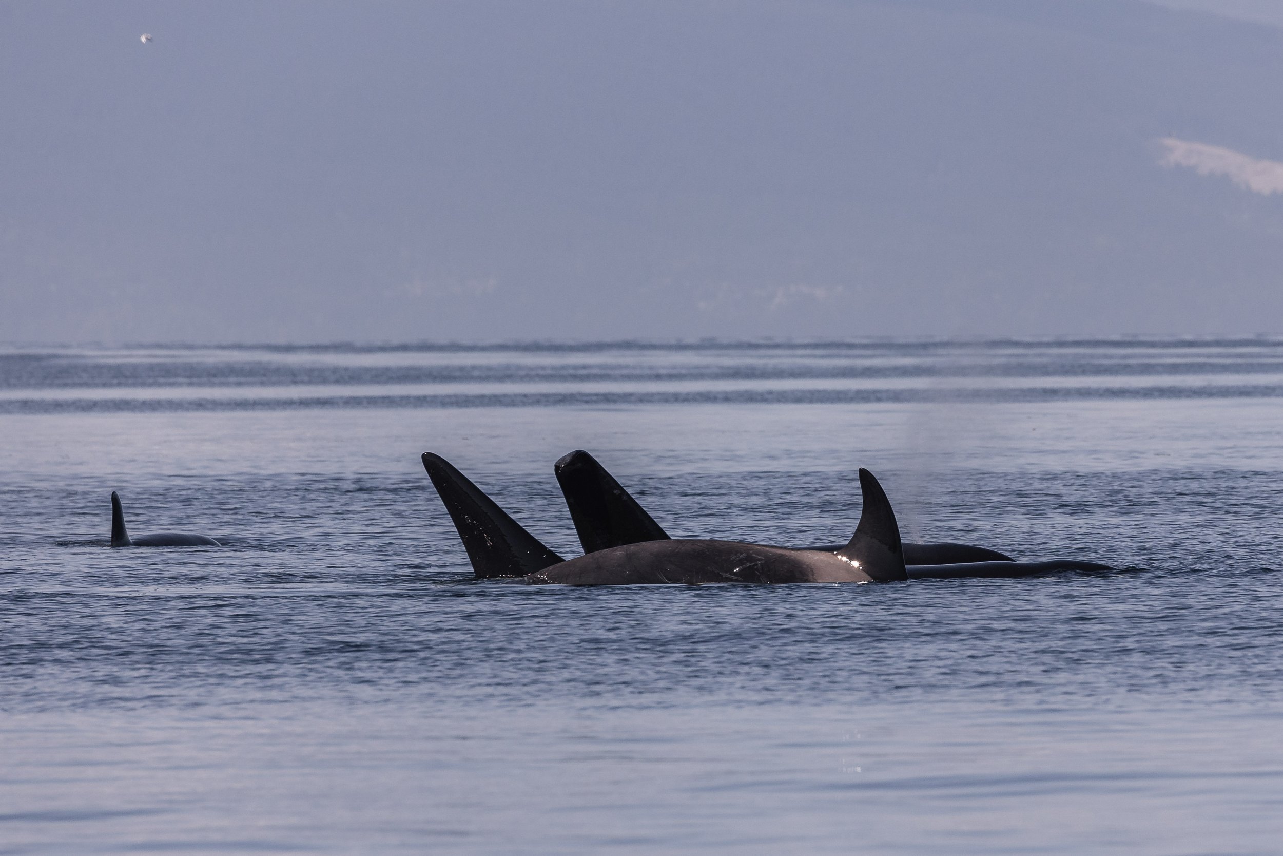 Once we had our time with the dolphins, our captains began to depart. We had caught word of an orca sighting nearby and we were eager to check it out. Eyes scanning the horizon, we caught sight of them north of Vance Island. Three large dorsal fins and a handful of smaller ones were travelling and socializing together. Marine Naturalists Vanessa and Aly quickly began capturing photos of the energetic group, working on identifying who was present. This turned out to be a mix of two lone males and one well-known matriline: