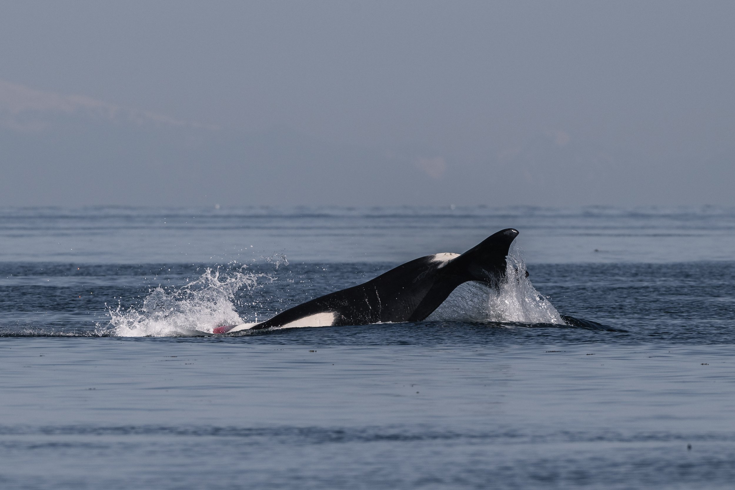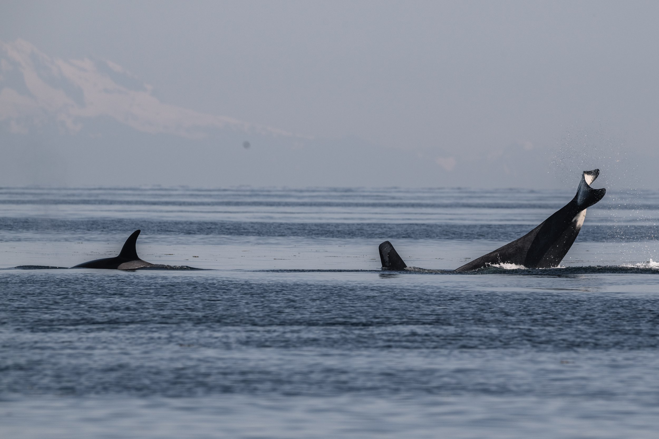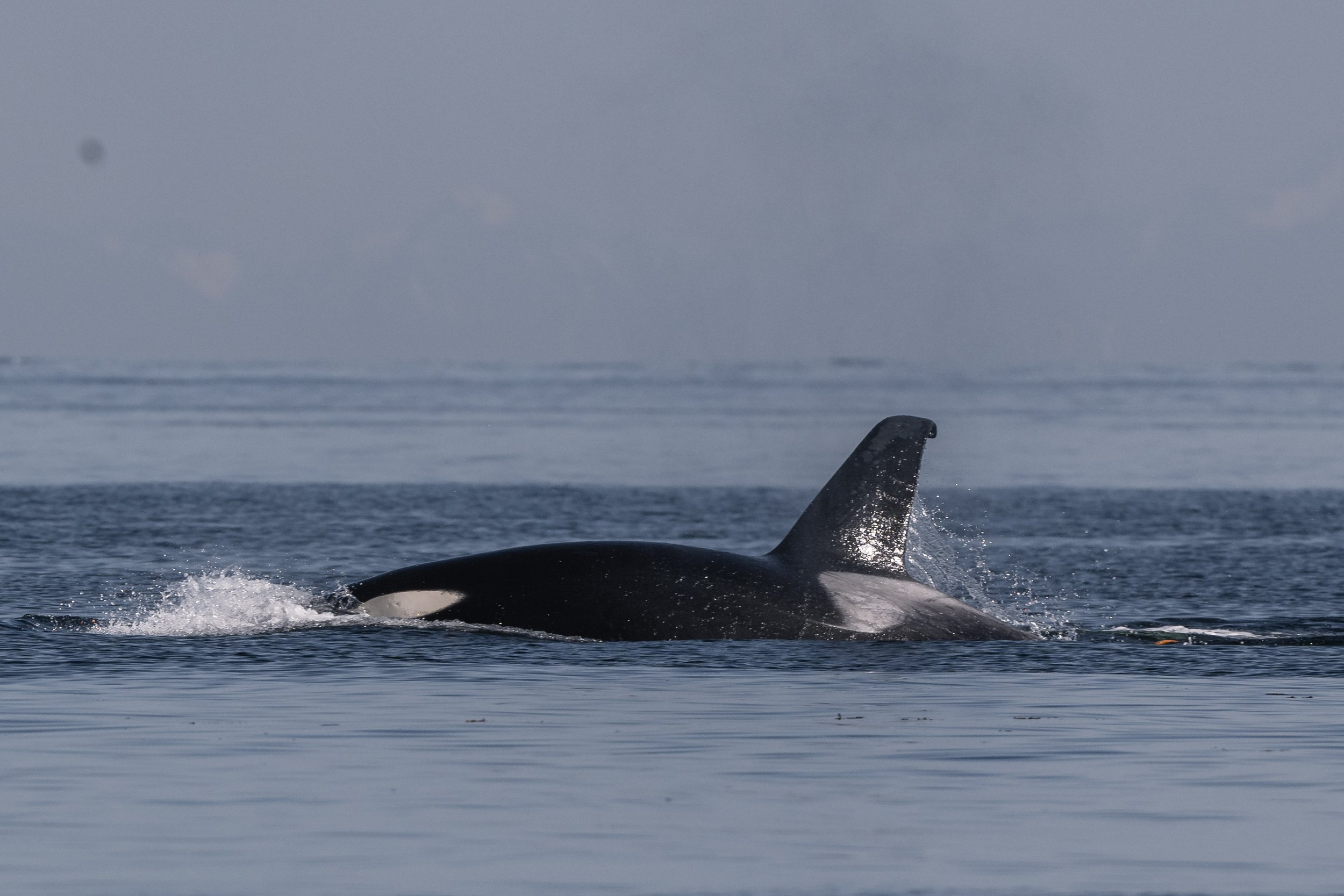 Once we had our time with the dolphins, our captains began to depart. We had caught word of an orca sighting nearby and we were eager to check it out. Eyes scanning the horizon, we caught sight of them north of Vance Island. Three large dorsal fins and a handful of smaller ones were travelling and socializing together. Marine Naturalists Vanessa and Aly quickly began capturing photos of the energetic group, working on identifying who was present. This turned out to be a mix of two lone males and one well-known matriline: