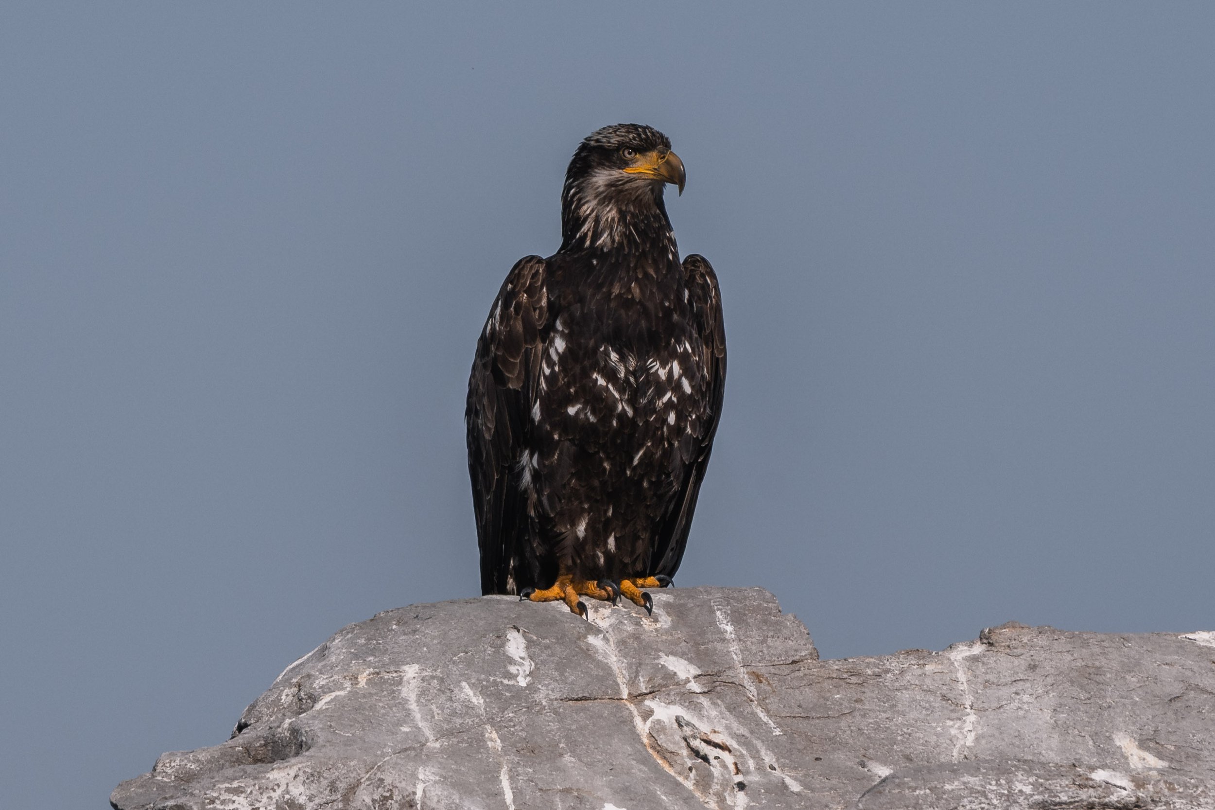 A juvenile Bald Eagle perched on the tip of the rocks. Photo by Aly Kohlman.