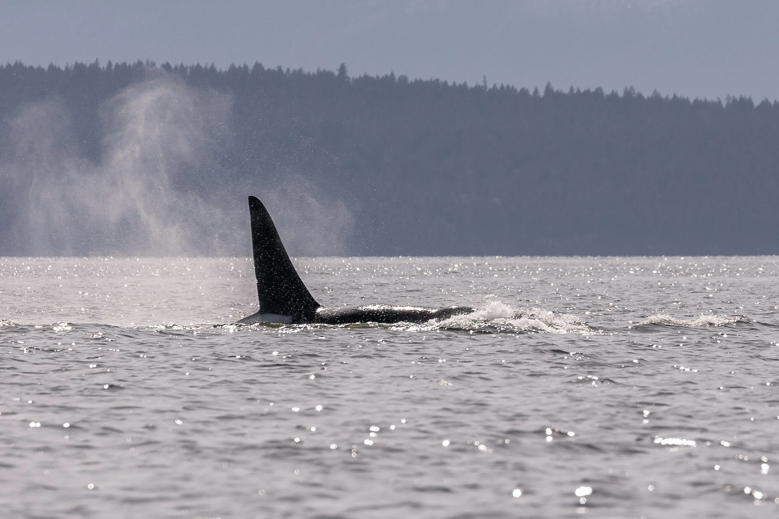 Beautiful sunny skies welcomed us aboard Cascadia, one of our open vessels, as we prepared for the journey ahead. Guests settled into their seats, adjusting layers and looking out over the calm water as Marine Naturalist Jordan introduced the day's plan. We would begin by heading into the Strait of Georgia, a vast stretch of water separating Vancouver Island from the mainland. With a quick rundown on what to watch for (dorsal fins, blows, and potentially flukes), we left the harbour behind and picked up speed, eyes scanning in every direction.