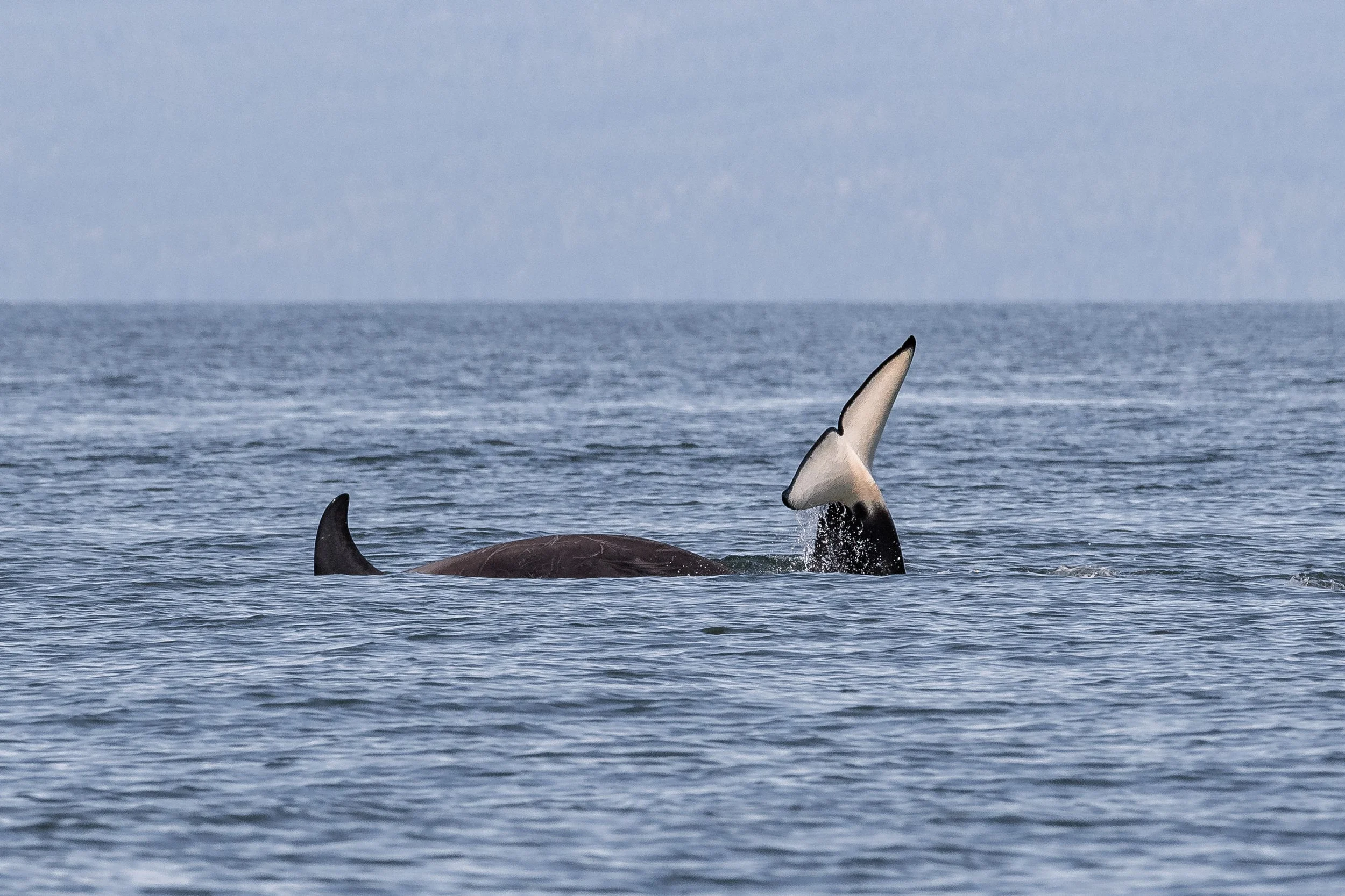With Chainsaw identified, we excitedly kept our eyes scanning to see if anyone else was around. He was travelling with his mother, T065 Whidbey, and as we followed their path, it became clear they were not alone. Ahead of them, more dorsal fins appeared, different shapes and sizes moving together in a loose formation. What we were witnessing was a gathering of multiple Transient matrilines, often called a T-party.
